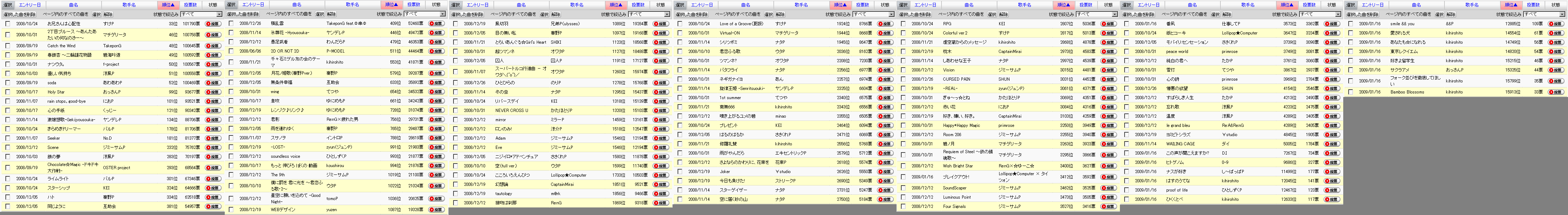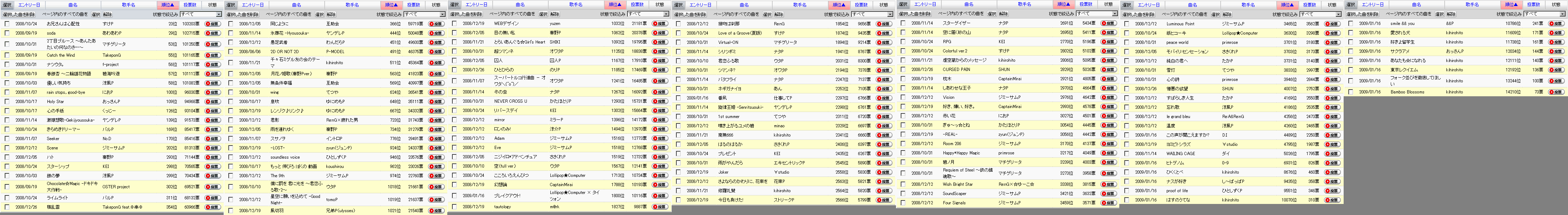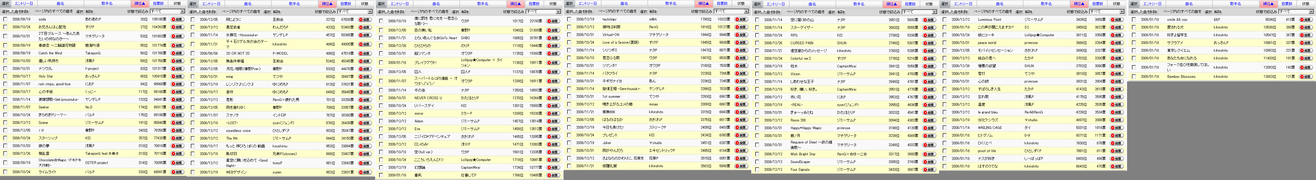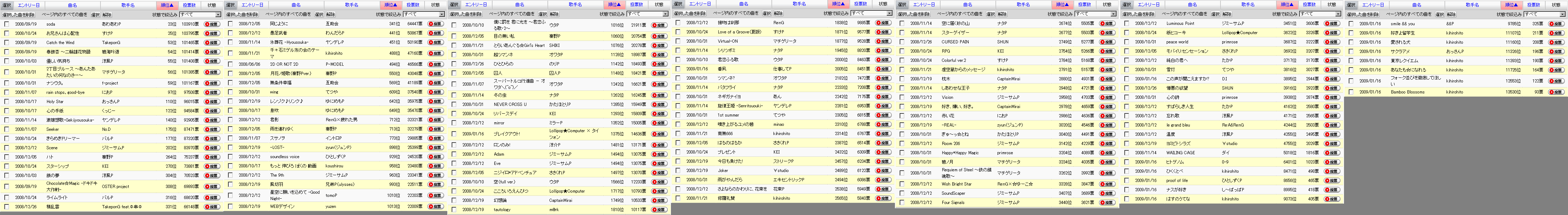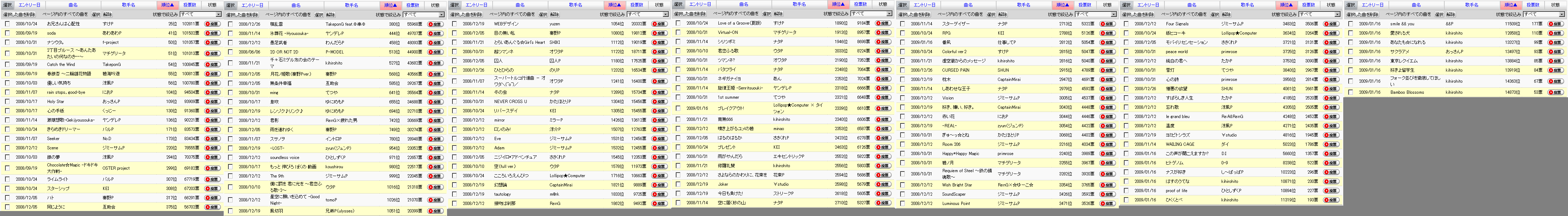 1/16エントリ曲のうち、「ブレイクアウト!」「番凩」が伸びています。 今月中の200位入りには遠いですが、勢いが続けば来月には狙えるでしょうか。 おすすめ曲に入れていた「氷葬花 -Hyousouka-」はペースが落ちてしまったので一旦おすすめから外させていただきます。 ヤンデレP支援の方は「激嬢想歌-Gekijyousouka-」優先でお願いします。 ~~~ ●オススメ投票曲 頑張れば、投票ペースが必要ペースに追いつきそうな曲。 具体的には、以下の通り。 200位以内の曲 Scene スターシップ ハト 同じように 積乱雲* ~~~ 予想ボーダー:102000票±5000票 単純計算予想ボーダー:102768票 (今の票数+投票ペース×残り日数+1日) 全曲の総票数:2876303票 昨日一日当たりの総投票数:73070票/日 今日の200位(カッコ内は、200位の投票ペース) 日付 時刻 順位 0118 08:02 200 地獄への階段〈完結編〉 聖飢魔II 2007/11/16 79248票(1568票/日) 順位 / 曲名 / 投票ペース / 必要ペース 33 / お兄さんは心配性 / 352 / 170 46 / 2丁目ブルース~あんた… / 292 / 249 48 / Catch the Wind / 920 / 258 49 / 春銀杏 / 1006 / 262 50 / ナツウタ。 / 136 / 264 51 / 優しい気持ち / 1004 / 265 52 / soda / 215 / 272 99 / Holy Star / 6544 / 794 101 / rain stops, good-bye / 2113 / 806 121 / 心の手紙 / 1161 / 1051 134 / 激嬢想歌-Gekijyousouka- / 1534 / 1176 178 / きらめきドリーマー / 2369 / 1715 181 / Seeker / 2347 / 1740 232 / Scene / 3503 / 2172 283 / 銀の夢 / 139 / 2600 293 / Chocolate☆Magic -ドキ... / 362 / 2726 301 / ライムライト / 598 / 2820 324 / スターシップ / 1816 / 3026 334 / ハト / 3406 / 3191 381 / 同じように / 3003 / 3773 409 / 積乱雲* / 3310 / 3965 446 / 氷葬花 -Hyousouka- / 226 / 4194 479 / 愚足武者 / 1968 / 4434 511 / 2D OR NOT 2D* / 3218 / 4580 553 / 千々石ミゲル友の会 / 2351 / 4779 579 / 月花ノ姫歌〈秦野Pver.〉 / 1033 / 4978 633 / 無条件幸福 / 1757 / 5239 654 / wing / 789 / 5344 661 / 息吹 / 717 / 5366 728 / レンゾク♪リンク♪ / 1447 / 5610 756 / 君影 / 569 / 5713 765 / 雨を連れゆく / 821 / 5732 788 / スサノヲ / 368 / 5799 991 / -LOST- / 731 / 6309 993 / soundless voice / 634 / 6317 994 / もっと 伸びろ ぼくの 動画 / 652 / 6317 1019 / The 9th / 540 / 6377 1022 / 僕に罰を 君に光を / 272 / 6383 1036 / 星空に願いを込めて -Good Night- / 897 / 6413 1087 / WEBデザイン / 718 / 6513 1089 / 風切羽 / 738 / 6517 1097 / 目の無い私 / 582 / 6526 1123 / とらいあんぐる☆Girl's Heart / 487 / 6572 1127 / 超ツマンネ / 242 / 6578 1191 / 囚人 / 381 / 6683 1260 / スーパートルコ\(^o^)/ / 365 / 6771 1278 / ひとひらの / 843 / 6787 1295 / 冬の虫 / 388 / 6813 1318 / リバースデイ / 155 / 6835 1320 / NEVER CROSS U / 219 / 6838 1459 / mirror / 417 / 6988 1518 / ロンのみ! / 1446 / 7035 1546 / Eve / 295 / 7062 1546 / Adam / 296 / 7062 1580 / ニジイロ*アドベンチュア / 295 / 7086 1599 / 空 / 114 / 7097 1733 / こころいろえんぴつ / 47 / 7192 1851 / 幻想論 / 365 / 7268 1856 / tautology / 191 / 7272 1869 / 接吻は刹那 / 139 / 7283 1924 / Love of a Groove(夏版) / 167 / 7326 1944 / Virtual-ON / 244 / 7333 1945 / シリツボミ / 33 / 7335 2036 / 君恋ふる歌 / 70 / 7372 2208 / ツマンネ? / 28 / 7444 2256 / バタフライ / 105 / 7463 2257 / ネギガナイヨ / 60 / 7464 2325 / 旋律王姫 -Senritsuouki- / 171 / 7492 2340 / 1st summer / 74 / 7494 2343 / 南無666 / 105 / 7496 2355 / 噴き上がるユメの碧 / 62 / 7500 2464 / プレゼント / 22 / 7531 2471 / はるのはるか / 198 / 7533 2556 / 修羅礼賛 / 39 / 7556 2579 / 雨がやんだら / 63 / 7561 2618 / さよならのかわりに、花束を / 83 / 7571 2626 / Joker / 182 / 7573 2690 / 今日も負けた! / 196 / 7589 2731 / スターゲイザー / 54 / 7596 2750 / 空に届く砂の山 / 84 / 7601 2807 / RPG / 60 / 7613 2817 / Colorful ver.2 / 41 / 7614 2868 / 虚空蔵からのメッセージ / 140 / 7625 2973 / 枕木 / 293 / 7647 2997 / しあわせな王子 / 46 / 7651 3015 / Vision / 85 / 7655 3031 / CURSED PAIN / 212 / 7658 3061 / -REAL- / 32 / 7664 3069 / ぎゅ~っ☆とね / 161 / 7665 3084 / 赤い花 / 131 / 7668 3103 / 好き、嫌い、好き。 / 167 / 7672 3250 / Happy*Happy Magic / 30 / 7696 3255 / Room 206 / 74 / 7697 3263 / 碧ノ月 / 24 / 7698 3295 / Requiem of Steel / 78 / 7703 3400 / Wish Bright Star / 70 / 7721 3412 / ブレイクアウト! / 2703 / 7724 3462 / SoundScaper / 65 / 7729 3473 / Luminous Point / 148 / 7730 3527 / Four Signals / 39 / 7737 3573 / 番凩 / 2177 / 7741 3647 / 紙ヒコーキ / 21 / 7751 3739 / モバイリ:センセーション / 20 / 7762 3749 / peace world / 32 / 7763 3761 / 純白の君へ / 25 / 7765 3867 / 雪灯 / 20 / 7774 3969 / 心の詩 / 20 / 7786 4154 / 憎悪の欲望 / 170 / 7804 4213 / すばらしき人生 / 20 / 7808 4223 / 忘れ歌 / 30 / 7810 4289 / le grand bleu / 23 / 7815 4289 / 温度 / 30 / 7815 4845 / ヨミビトシラズ / 39 / 7853 5005 / WAILING CAGE / 11 / 7863 7267 / この声が聞こえますか?* / 475 / 7944 9686 / ヒトゲノム / 230 / 7975 11499 / ナスが好き / 86 / 7986 12045 / はすのうてな / 77 / 7989 12467 / proof of life / 58 / 7991 12633 / ひくくとべ / 75 / 7991 12885 / smile && you / 58 / 7992 14554 / 愛される犬 / 31 / 7995 14749 / あなたも☆になれる / 24 / 7996 14820 / 東京レクイエム / 30 / 7996 15215 / 好きよ留学生 / 16 / 7996 15325 / サクラアメ / 18 / 7997 15799 / フォーク並びを徹底してほしい / 14 / 7997 15913 / Bamboo Blossoms / 12 / 7997 |