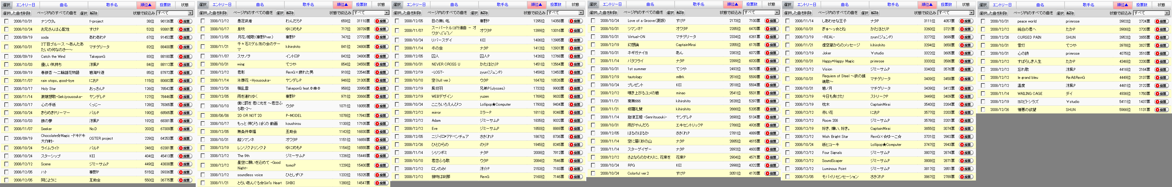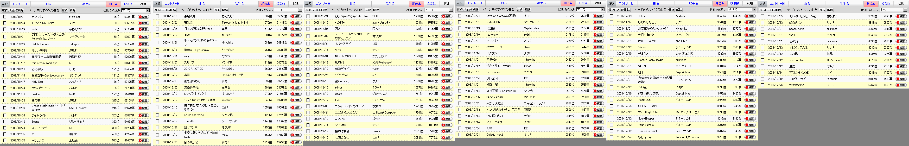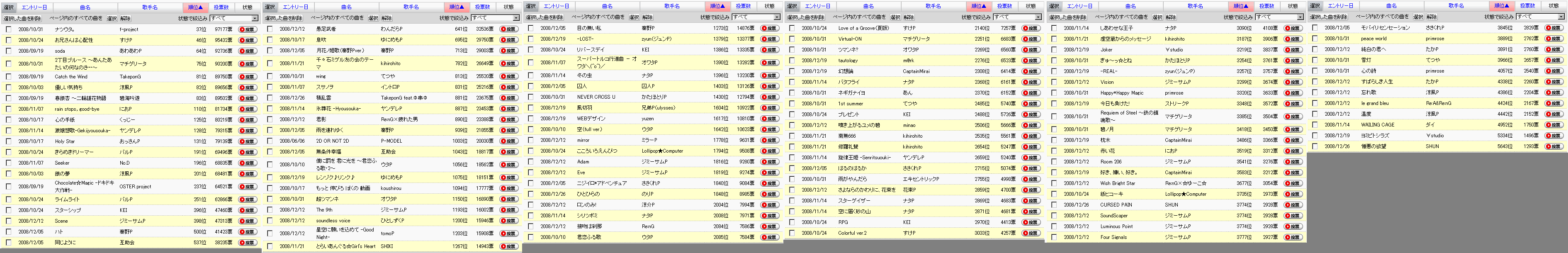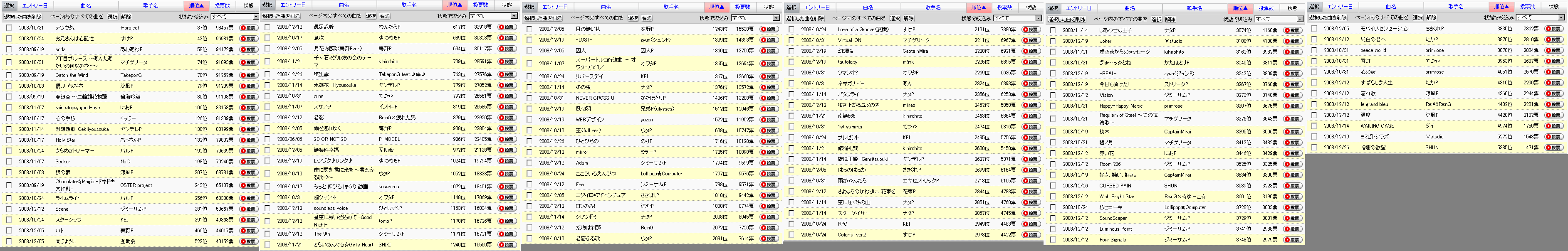 上位曲のうち、暫定200位以内の曲のペースがやや上がっているのはいい感じです。 引き続き上位曲は10万票まで上げる方向でお願いします。 ~~~ ●オススメ投票曲 頑張れば、投票ペースが必要ペースに追いつきそうな曲。 具体的には、以下の通り。 1000位以内の曲 無条件幸福 (積乱雲は1000位以内に入ったため個別指定は外しましたが引き続き対象です) ~~~ 予想ボーダー:100000票±5000票 単純計算予想ボーダー:94368票 (今の票数+投票ペース×残り日数+1日) 全曲の総票数:2262586票 昨日一日当たりの総投票数:60372票/日 今日の200位(カッコ内は、200位の投票ペース) 日付 時刻 順位 0109 08:01 200 RUNAWAY doa 2008/05/30 67440票(1122票/日) 順位 / 曲名 / 投票ペース / 必要ペース 38 / ナツウタ。 / 1120 / 312 52 / お兄さんは心配性 / 1887 / 415 67 / soda / 1385 / 525 82 / 2丁目ブルース~あんた… / 1759 / 664 83 / Catch the Wind / 1500 / 674 84 / 優しい気持ち / 1664 / 677 85 / 春銀杏 / 1774 / 683 115 / rain stops, good-bye / 1148 / 1014 126 / Holy Star / 1930 / 1112 127 / 激嬢想歌-Gekijyousouka- / 1033 / 1116 128 / 心の手紙 / 1256 / 1120 190 / きらめきドリーマー / 981 / 1565 192 / 銀の夢 / 141 / 1574 203 / Seeker / 991 / 1622 229 / Chocolate☆Magic -ドキ... / 646 / 1761 246 / ライムライト / 572 / 1846 404 / スターシップ / 1069 / 2618 449 / Scene / 2465 / 2689 515 / ハト / 2400 / 2894 550 / 同じように / 1881 / 3010 659 / 愚足武者 / 2104 / 3268 717 / 息吹 / 702 / 3376 747 / 月花ノ姫歌〈秦野Pver.〉 / 1057 / 3422 841 / 千々石ミゲル友の会 / 1530 / 3554 842 / スサノヲ / 415 / 3554 854 / wing / 757 / 3566 910 / 君影 / 1176 / 3657 946 / 氷葬花 -Hyousouka- / 114 / 3713 958 / 積乱雲* / 2751 / 3729 971 / 雨を連れゆく / 919 / 3742 1071 / 僕に罰を 君に光を / 243 / 3861 1078 / 2D OR NOT 2D* / 2052 / 3866 1130 / もっと 伸びろ ぼくの 動画 / 304 / 3904 1142 / 無条件幸福 / 2621 / 3917 1151 / 超ツマンネ / 274 / 3925 1154 / レンゾク♪リンク♪ / 915 / 3929 1226 / The 9th / 678 / 3980 1229 / 星空に願いを込めて -Good Night- / 574 / 3982 1232 / soundless voice / 690 / 3985 1280 / とらいあんぐる☆Girl's Heart / 474 / 4021 1295 / 目の無い私 / 401 / 4029 1399 / スーパートルコ\(^o^)/ / 296 / 4090 1406 / リバースデイ / 430 / 4092 1412 / 冬の虫 / 255 / 4094 1426 / 囚人 / 564 / 4101 1451 / NEVER CROSS U / 229 / 4111 1459 / -LOST- / 585 / 4116 1647 / 空 / 136 / 4203 1732 / 風切羽 / 662 / 4232 1769 / WEBデザイン / 812 / 4244 1793 / こころいろえんぴつ / 82 / 4254 1811 / mirror / 290 / 4261 1835 / Adam / 478 / 4271 1850 / Eve / 315 / 4279 1867 / ニジイロ*アドベンチュア / 416 / 4285 1945 / ひとひらの / 899 / 4307 2008 / シリツボミ / 33 / 4322 2084 / 君恋ふる歌 / 114 / 4339 2153 / ロンのみ! / 189 / 4355 2160 / 接吻は刹那 / 237 / 4357 2173 / Love of a Groove(夏版) / 184 / 4359 2285 / ツマンネ? / 53 / 4388 2334 / Virtual-ON / 231 / 4397 2355 / 幻想論 / 294 / 4401 2382 / ネギガナイヨ / 60 / 4406 2399 / バタフライ / 125 / 4408 2492 / 1st summer / 88 / 4424 2516 / tautology / 411 / 4427 2518 / プレゼント / 32 / 4428 2541 / 噴き上がるユメの碧 / 122 / 4430 2628 / 南無666 / 178 / 4441 2666 / 修羅礼賛 / 91 / 4445 2690 / 旋律王姫 -Senritsuouki- / 105 / 4448 2766 / 雨がやんだら / 197 / 4458 2781 / はるのはるか / 105 / 4460 2885 / 空に届く砂の山 / 49 / 4472 2892 / スターゲイザー / 63 / 4473 2904 / さよならのかわりに、花束を / 70 / 4474 2998 / RPG / 80 / 4485 3051 / Colorful ver.2 / 73 / 4492 3111 / しあわせな王子 / 40 / 4497 3260 / ぎゅ~っ☆とね / 151 / 4513 3277 / -REAL- / 20 / 4514 3294 / 虚空蔵からのメッセージ / 156 / 4516 3322 / Joker / 214 / 4518 3333 / Happy*Happy Magic / 22 / 4519 3340 / Vision / 72 / 4519 3409 / Requiem of Steel / 52 / 4525 3439 / 碧ノ月 / 27 / 4527 3449 / 今日も負けた! / 167 / 4527 3540 / 枕木 / 135 / 4533 3577 / 赤い花 / 67 / 4536 3578 / Room 206 / 76 / 4536 3655 / 好き、嫌い、好き。 / 215 / 4542 3731 / Wish Bright Star / 133 / 4547 3747 / 紙ヒコーキ / 120 / 4548 3807 / Four Signals / 70 / 4551 3808 / SoundScaper / 54 / 4551 3817 / Luminous Point / 55 / 4552 3867 / モバイリ:センセーション / 38 / 4555 3902 / peace world / 46 / 4558 3906 / 純白の君へ / 20 / 4558 3952 / CURSED PAIN / 168 / 4561 3978 / 雪灯 / 22 / 4562 4075 / 心の詩 / 20 / 4568 4346 / すばらしき人生 / 20 / 4580 4416 / 忘れ歌 / 21 / 4583 4449 / le grand bleu / 10 / 4585 4461 / 温度 / 20 / 4585 4936 / WAILING CAGE / 0 / 4602 5411 / ヨミビトシラズ / 27 / 4617 5966 / 憎悪の欲望 / 128 / 4630