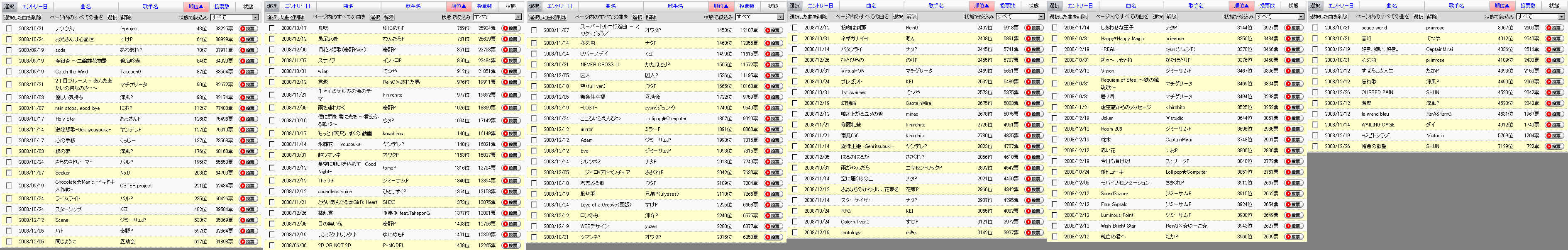 http://bbs12.aimix-z.com/topic.cgi?room=matcha が都合でお休みされるとの事ですので、代わりにはなりませんが毎日の記録だけ取って見ます。 予想ボーダー:100000票±5000票 単純計算予想ボーダー:86296票 (今の票数+投票ペース×残り日数+1日) 全曲の総票数:2073340票 昨日一日当たりの総投票数:50481票/日 今日の200位(カッコ内は、200位の投票ペース) 日付 時刻 順位 0106 08:40 200 終幕グランギニヨル 片霧烈火@弘田佳孝 2007/09/21 65128票(784票/日) 順位 / 曲名 / 投票ペース / 必要ペース 43 / ナツウタ。 / 1032 / 471 64 / お兄さんは心配性 / 1345 / 643 70 / soda / 1129 / 684 84 / 春銀杏 / 2045 / 839 87 / Catch the Wind / 2000 / 857 90 / 2丁目ブルース~あんた… / 2219 / 893 93 / 優しい気持ち / 2045 / 913 112 / rain stops, good-bye / 570 / 1100 126 / Holy Star / 53 / 1180 127 / 激嬢想歌-Gekijyousouka- / 441 / 1188 137 / 心の手紙 / 1076 / 1257 176 / 銀の夢 / 28 / 1473 195 / きらめきドリーマー / 350 / 1574 203 / Seeker / 530 / 1612 221 / Chocolate☆Magic -ドキ... / 390 / 1701 235 / ライムライト / 195 / 1783 482 / スターシップ / 1079 / 2617 533 / Scene / 2751 / 2785 597 / ハト / 1866 / 2885 617 / 同じように / 1597 / 2924 769 / 息吹 / 590 / 3163 781 / 愚足武者 / 1469 / 3175 851 / 月花ノ姫歌〈秦野Pver.〉 / 620 / 3250 860 / スサノヲ / 414 / 3261 912 / wing / 636 / 3326 976 / 君影 / 634 / 3404 977 / 千々石ミゲル友の会 / 985 / 3404 1026 / 雨を連れゆく / 517 / 3465 1094 / 僕に罰を 君に光を / 287 / 3514 1140 / もっと 伸びろ ぼくの 動画 / 367 / 3554 1148 / 氷葬花 -Hyousouka- / 675 / 3559 1163 / 超ツマンネ / 259 / 3567 1316 / 星空に願いを込めて -Good Night- / 510 / 3652 1340 / The 9th / 656 / 3664 1364 / soundless voice / 484 / 3674 1373 / とらいあんぐる☆Girl's Heart / 591 / 3677 1377 / 積乱雲* / 2561 / 3680 1403 / 目の無い私 / 361 / 3692 1431 / レンゾク♪リンク♪ / 1007 / 3706 1438 / 2D OR NOT 2D* / 545 / 3709 1453 / スーパートルコ\(^o^)/ / 325 / 3716 1460 / 冬の虫 / 1507 / 3718 1499 / リバースデイ / 64 / 3735 1505 / NEVER CROSS U / 242 / 3737 1536 / 囚人 / 282 / 3752 1665 / 空 / 45 / 3793 1722 / 無条件幸福 / 3009 / 3810 1749 / -LOST- / 507 / 3818 1807 / こころいろえんぴつ / 70 / 3839 1891 / mirror / 219 / 3865 1993 / Eve / 228 / 3887 1993 / Adam / 229 / 3887 2013 / シリツボミ / 49 / 3890 2042 / ニジイロ*アドベンチュア / 222 / 3895 2109 / 君恋ふる歌 / 14 / 3909 2110 / 風切羽 / 524 / 3909 2225 / Love of a Groove(夏版) / 106 / 3934 2240 / ロンのみ! / 210 / 3937 2280 / WEBデザイン / 766 / 3945 2316 / ツマンネ? / 66 / 3950 2402 / 接吻は刹那 / 105 / 3963 2408 / ネギガナイヨ / 20 / 3964 2445 / バタフライ / 111 / 3970 2455 / ひとひらの / 522 / 3972 2469 / Virtual-ON / 290 / 3974 2532 / プレゼント / 22 / 3980 2573 / 1st summer / 32 / 3985 2675 / 幻想論 / 186 / 3997 2678 / 噴き上がるユメの碧 / 50 / 3997 2725 / 修羅礼賛 / 88 / 4002 2780 / 南無666 / 134 / 4007 2823 / 旋律王姫 -Senritsuouki- / 73 / 4012 2856 / はるのはるか / 92 / 4016 2892 / 雨がやんだら / 87 / 4018 2921 / 空に届く砂の山 / 26 / 4022 2966 / さよならのかわりに、花束を / 73 / 4026 2987 / スターゲイザー / 62 / 4028 3065 / RPG / 72 / 4037 3121 / Colorful ver.2 / 21 / 4041 3142 / tautology / 958 / 4043 3144 / しあわせな王子 / 60 / 4043 3356 / Happy*Happy Magic / 32 / 4061 3370 / -REAL- / 48 / 4061 3376 / ぎゅ~っ☆とね / 20 / 4062 3467 / Vision / 112 / 4067 3469 / Requiem of Steel / 24 / 4067 3494 / 碧ノ月 / 22 / 4068 3525 / 虚空蔵からのメッセージ / 68 / 4070 3644 / Joker / 89 / 4078 3695 / Room 206 / 76 / 4081 3748 / 枕木 / 147 / 4084 3800 / 赤い花 / 97 / 4087 3848 / 今日も負けた! / 148 / 4089 3851 / 紙ヒコーキ / 120 / 4090 3912 / モバイリ:センセーション / 26 / 4093 3915 / SoundScaper / 64 / 4094 3924 / Four Signals / 62 / 4094 3930 / Luminous Point / 53 / 4094 3943 / Wish Bright Star / 54 / 4095 3960 / 純白の君へ / 20 / 4096 3967 / peace world / 20 / 4096 4012 / 雪灯 / 20 / 4098 4036 / 好き、嫌い、好き。 / 212 / 4099 4109 / 心の詩 / 20 / 4103 4393 / すばらしき人生 / 20 / 4114 4490 / 忘れ歌 / 30 / 4117 4520 / CURSED PAIN / 28 / 4118 4520 / 温度 / 20 / 4118 4631 / le grand bleu / 12 / 4121 4912 / WAILING CAGE / 0 / 4130 5769 / ヨミビトシラズ / 32 / 4152 7129 / 憎悪の欲望 / 108 / 4171
